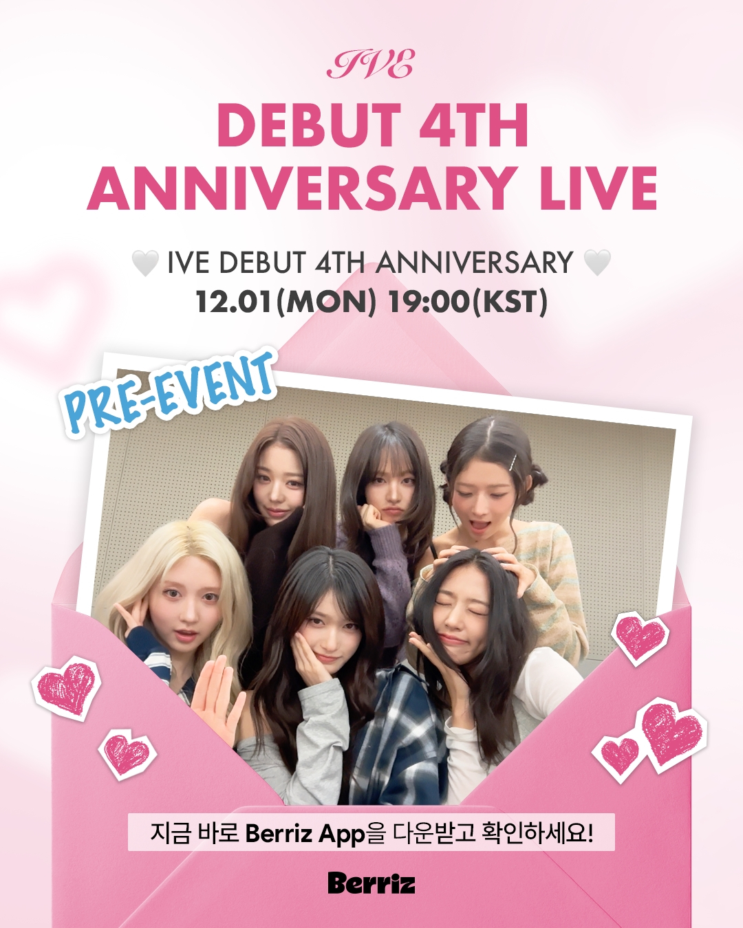 글로벌 K컬처 팬 플랫폼 베리즈(Berriz)에 따르면, 아이브(안유진, 가을, 레이, 장원영, 리즈, 이서)는 1일 데뷔 4주년을 기념해 스페셜 라이브 '♡IVE DEBUT 4TH ANNIVERSARY♡'로 다이브(팬덤명) 함께한다. 이들은 1일 오후 7시 베리즈 내 공식 팬 커뮤니티를 통해 팬들을 찾는다.
