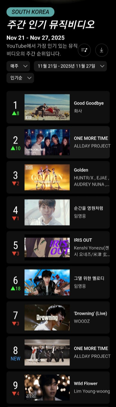 유튜브 한국 주간 인기 뮤직비디오 차트(11월 21일~11월 27일)에 따르면, 지난 8월 28일 공개된 임영웅 정규 2집 'IM HERO 2' 타이틀곡 '순간을 영원처럼' 뮤직비디오가 4위을 기록했다. '순간을 영원처럼'은 임영웅의 두 번째 정규 앨범 'IM HERO 2'의 타이틀곡으로, 서정적인 가사와 함께 인생에 대한 깊은 울림을 전하고 있다.
