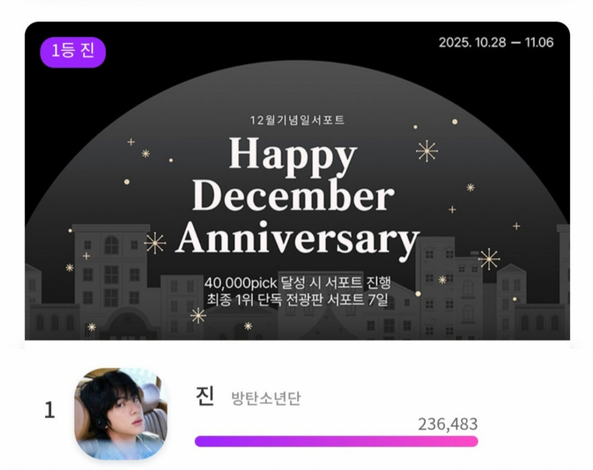 방탄소년단 진이 아이돌픽에서 진행한 '12월 기념일 서포트' 1위를 차지하며 다가오는 생일 시즌의 주인공으로 주목받고 있다.