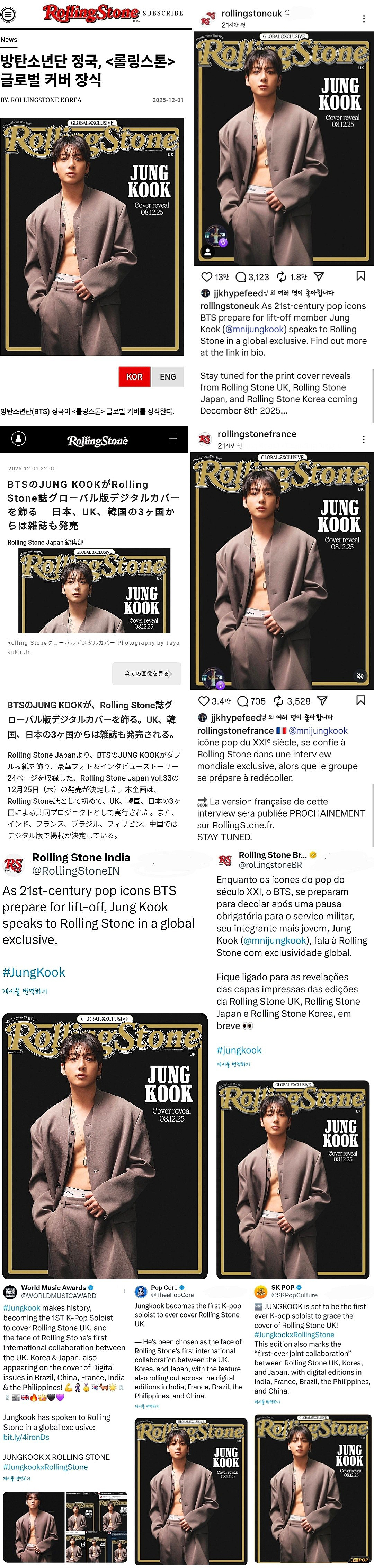 정국은 미국 대표 대중문화 잡지 롤링스톤의 글로벌 커버를 장식했다. 정국은 롤링스톤 코리아, UK, 재팬, 프랑스, 인디아, 브라질, 필리핀, 중국이 공동으로 선보이는 글로벌 특집 기획에 커버를 장식한다.