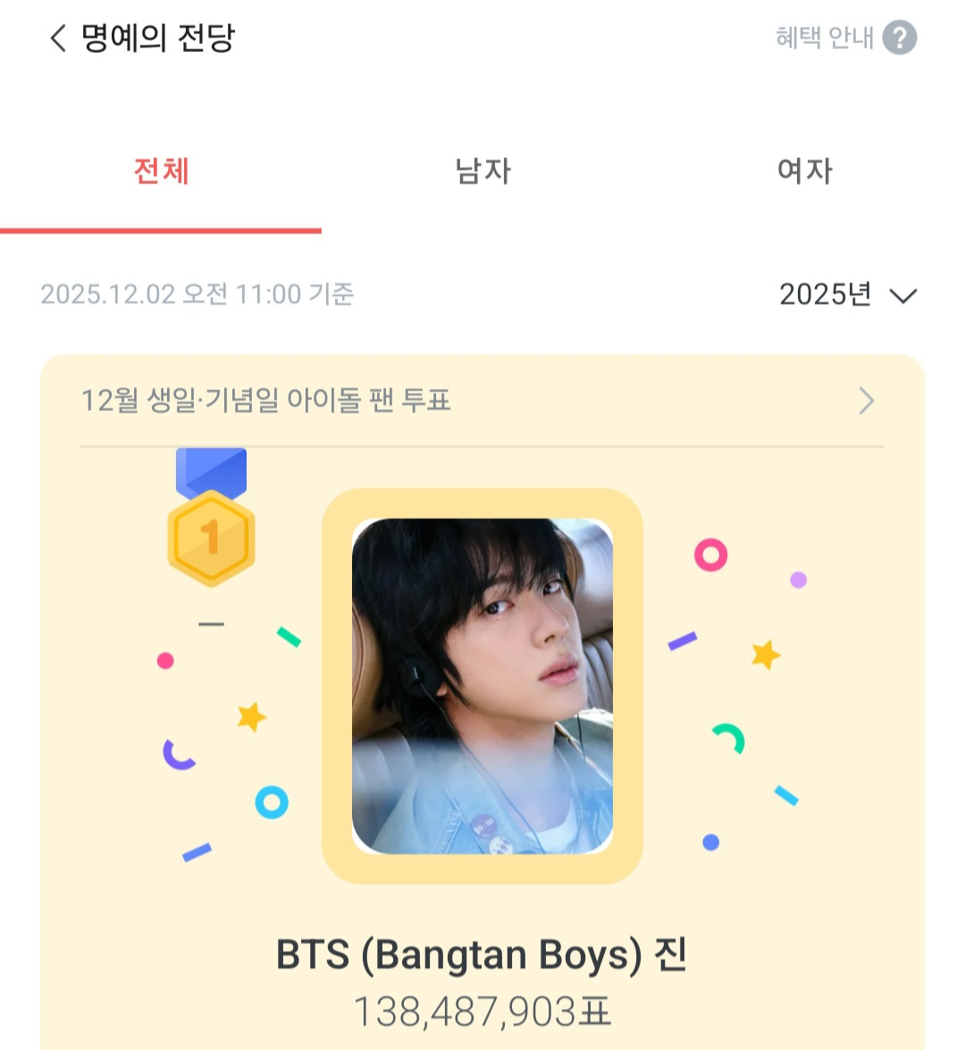 팬플러스는 1월 생일·기념일 투표 오픈부터 12월 투표 마감까지, 한 해 동안 진행된 모든 투표를 종합해 연도별 전체 순위를 발표하며, 상위 기록자들을 '명예의 전당'에 등극시킨다. 진은 전체 순위 1위를 차지하며 명예의 전당에 이름을 올렸다.
