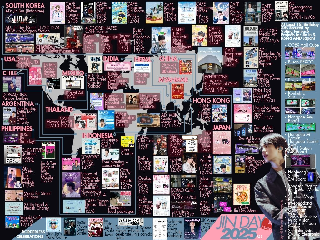 팬들에게는 가장 큰 축제나 다름없는 진의 생일은 이번에도 화려한 이벤트로 막을 열었다. 한국을 비롯해 일본, 미얀마, 인도, 아르헨티나 등 다양한 국가의 팬들이 광고, 카페 이벤트, 기부 프로젝트, 문화 체험 프로그램까지 다채로운 방식으로 생일을 기념했다.