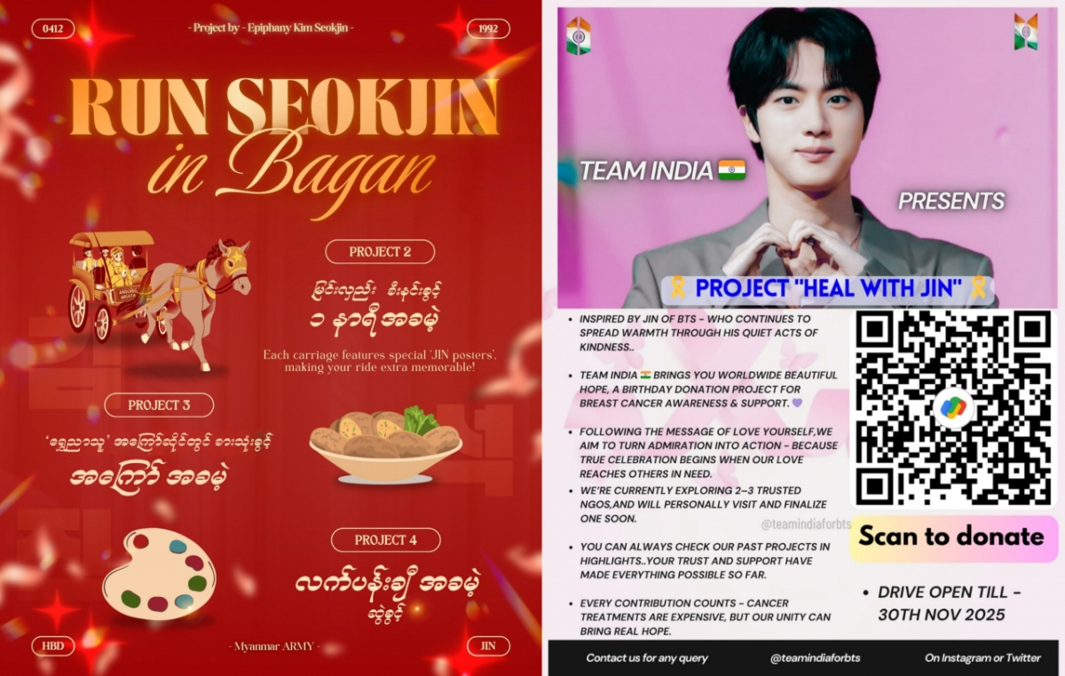 미얀마 팬베이스(JIN MYANMAR)는 유네스코 세계유산 바간에서 '2025 JIN DAY BIRTHDAY PROJECT'를 펼친다. 세계 최초로 아이돌 생일을 핫에어 벌룬 비행 중 축하하며, 무료 마차 타기(33대, 100명 이상), 미얀마 전통 튀김 스낵 뷔페, 전통 꽃 문양 핸드페인팅(Yun-Kanut) 체험, 아난다 사원에서의 1800개 오일 램프 점등식 등 전통문화를 잘 살린 체험과 진의 생일 축하를 결합한 프로그램으로 큰 호응을 얻었다.