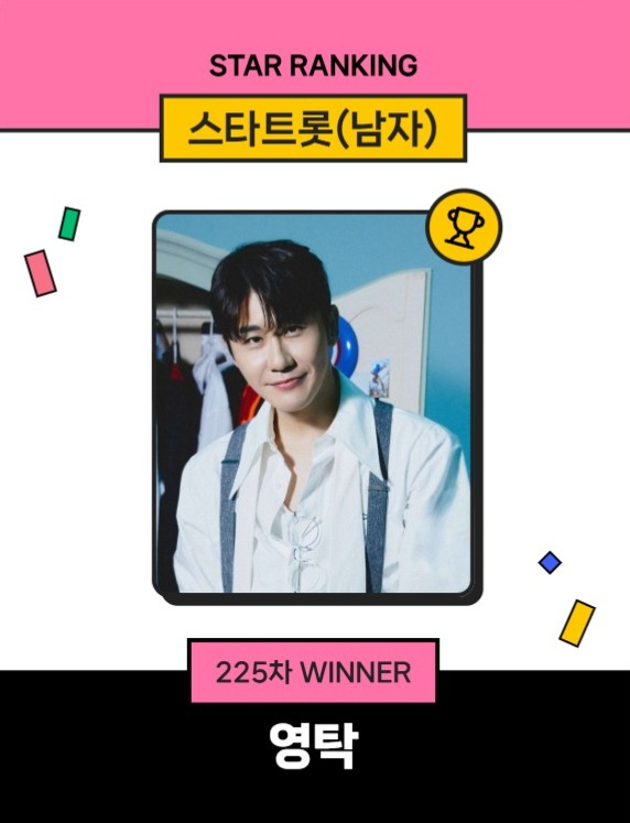 영탁은 지난 27일 오후 3시 1분부터 12월 4일 오후 3시까지 진행된 225차 스타랭킹 스타트롯 남자 랭킹 투표에서 21만 5773표를 얻으며 1위를 차지했다.