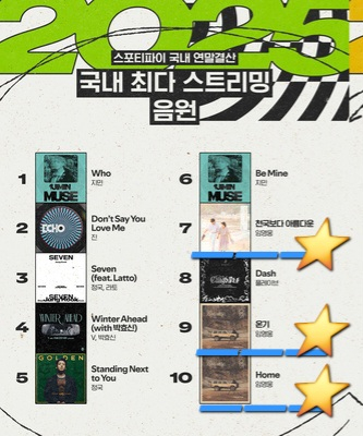 임영웅은 스포티파이 국내 연말 결산 '국내 최다 스트리밍 음원' 부문에서도 톱10에 무려 3곡을 올렸다.