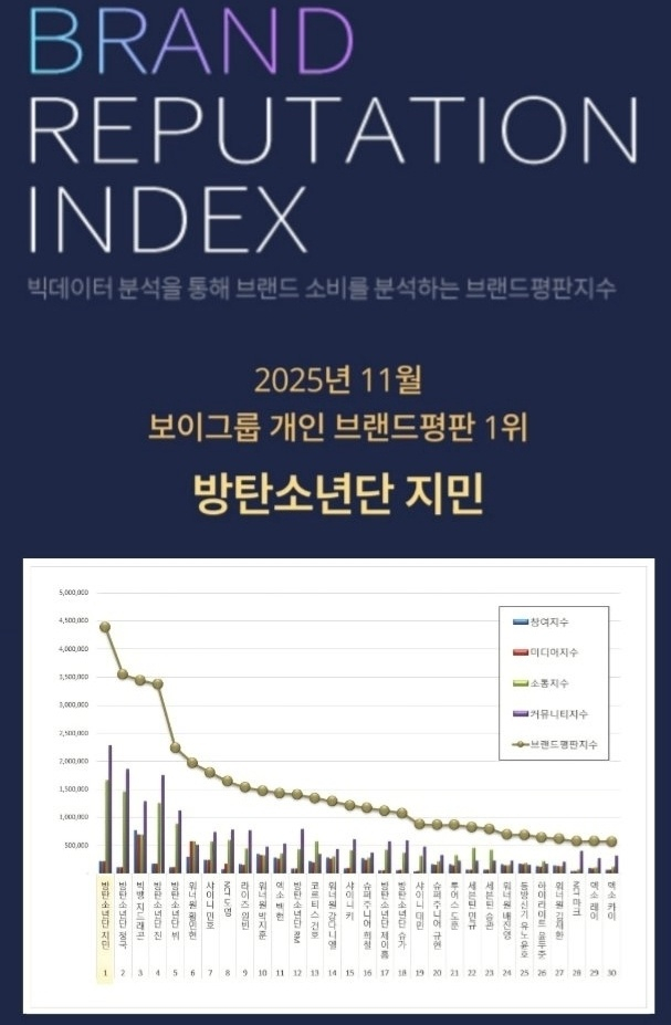 방탄소년단(BTS) 지민이 11월 보이그룹 개인 브랜드평판과 아이돌 통합 개인 브랜드평판 모두 2개월 연속 1위를 차지하며 압도적인 인기를 입증했다.