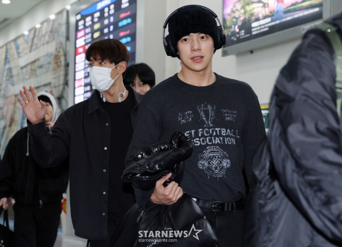 그룹 몬스타엑스 셔누, 민혁이 대만 가오슝에서 스타뉴스 주최로 열리는'10주년 아시아 아티스트 어워즈 2025(10th Anniversary Asia Artist Awards 2025, '10주년 AAA 2025') 참석을 위해 5일 대만 가오슝 국제공항을 통해 입국하고 있다.