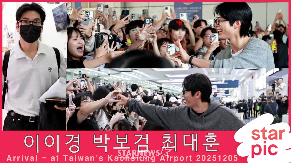 연예K-POP이이경-박보검-최대훈 '대만팬들 사랑해요!' [★영상]발행 : 2025.12.05 ・ 21:07가오슝(대만)=임성균 기자배우 이이경, 박보검, 최대훈이 대만 가오슝에서 열리는 '10주년 아시아 아티스트 어워즈 2025(10th Anniversary Asia Artist Awards 2025, '10주년 AAA 2025') 참석을 위해 5일 오후 대만가오슝 국제공항을 통해 입국하고 있다. 2025.12.05<저작권자 © 스타뉴스, 무단전재 및 재배포 금지>공항패션AAAAAA2025윤아이이경박보검추천 기사임성균 기자기자홈좋아요 연예-K-POP의 인기 급상승 뉴스연예-K-POP의 최신 뉴스