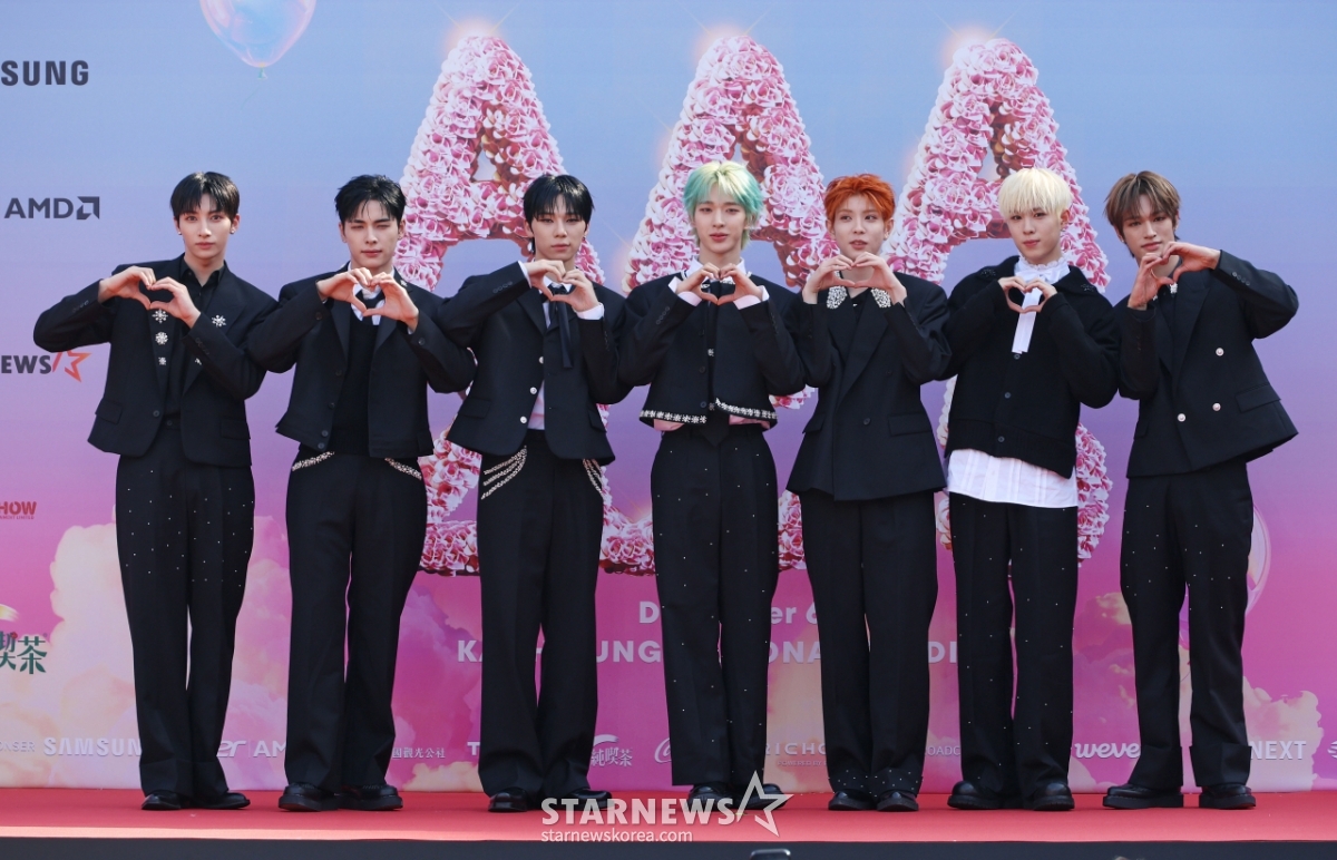 그룹 넥스지가 6일 대만 가오슝 내셔널 스타디움에서 진행된 스타뉴스 주최 '10주년 아시아 아티스트 어워즈 2025(10th Anniversary Asia Artist Awards 2025, '10주년 AAA 2025') 레드카펫 행사에 참석해 포즈를 취하고 있다.