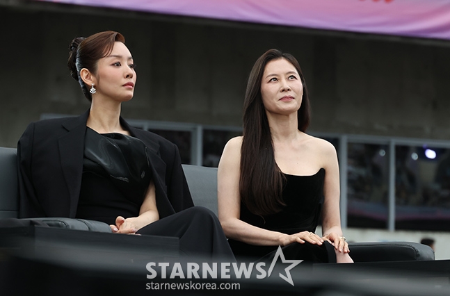 배우 문소리와 차주영이 6일 가오슝 내셔널 스타디움에서 진행된 스타뉴스 주최 '10주년 아시아 아티스트 어워즈 2025(10th Anniversary Asia Artist Awards 2025, '10주년 AAA 2025')에서 무대를 바라보고 있다.