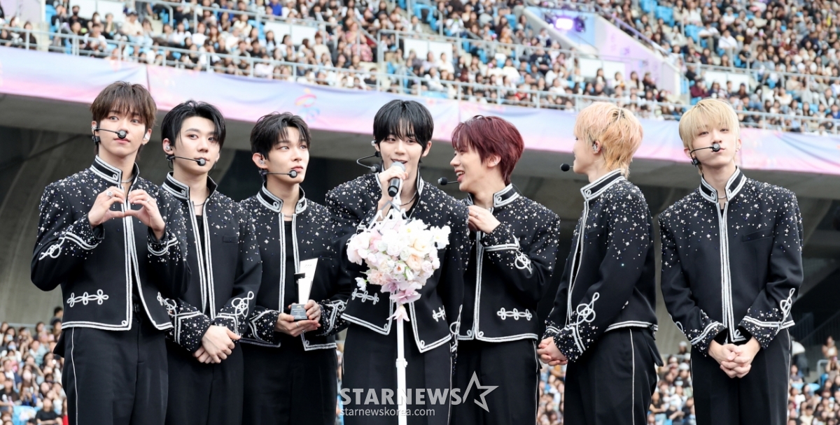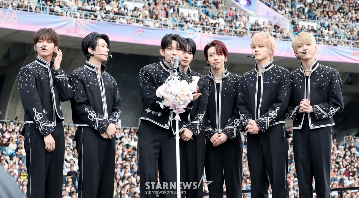 AAA 베스트 뉴 아티스트 상을 수상한 AHOF이 6일 대만 가오슝 내셔널 스타디움에서 진행된 스타뉴스 주최 '10주년 아시아 아티스트 어워즈 2025(10th Anniversary Asia Artist Awards 2025, '10주년 AAA 2025')에서 수상소감을 전하고 있다. 12월 6일~7일 양일에 걸쳐 가오슝 내셔널 스타디움에서 펼쳐지는 '10주년 아시아 아티스트 어워즈 2025(10th Anniversary Asia Artist Awards 2025, '10주년 AAA 2025')'와 페스타 'ACON 2025'는 MTN(머니투데이방송)과 위버스(Weverse)를 통해 각각 TV와 온라인 스트리밍으로 생중계 된다. 2025.12.06