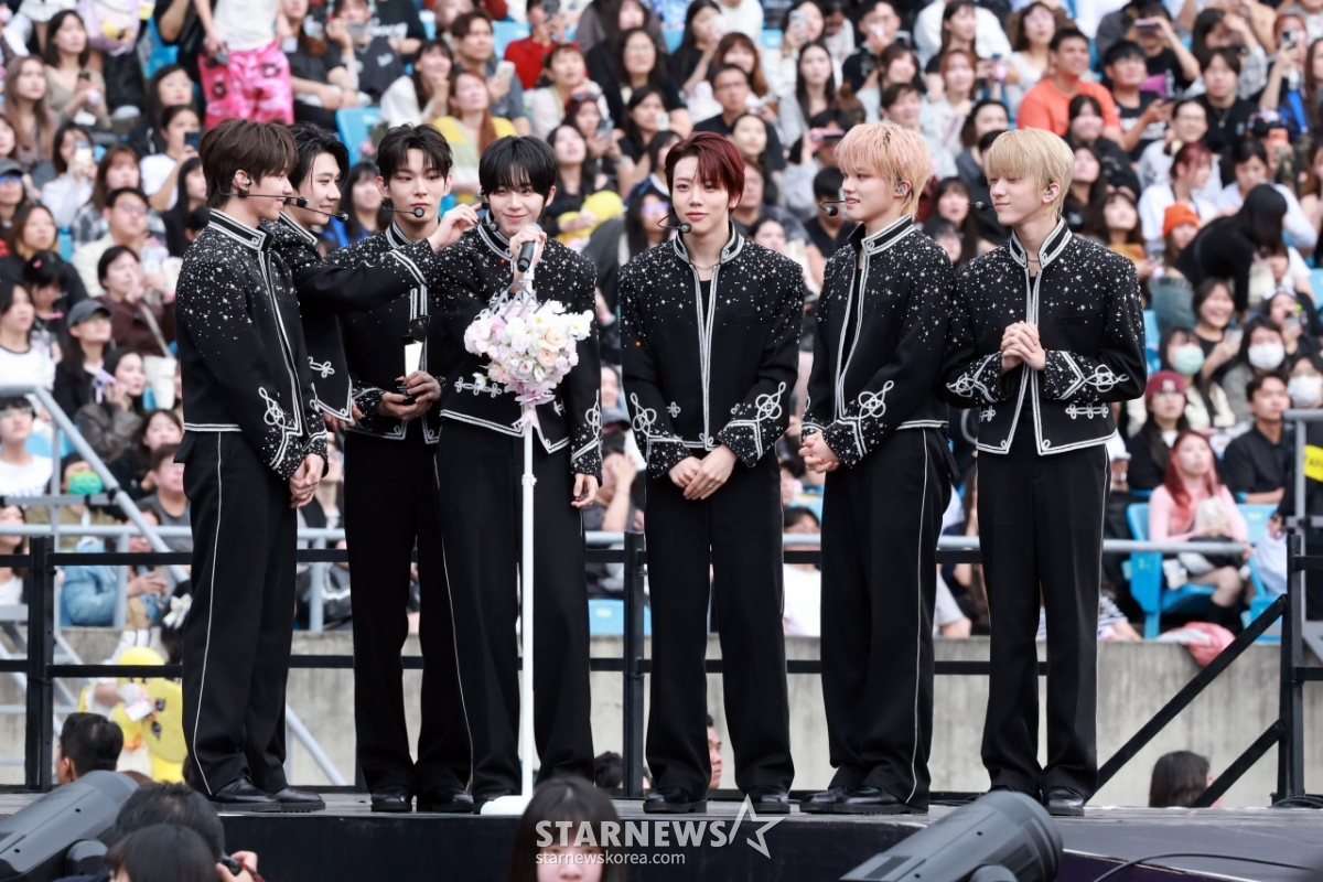 그룹 아홉이 6일 대만 가오슝 내셔널 스타디움에서 진행된 스타뉴스 주최 '10주년 아시아 아티스트 어워즈 2025(10th Anniversary Asia Artist Awards 2025, '10주년 AAA 2025')에서 AAA Best New Artist상을 받고 수상소감을 말하고 있다.