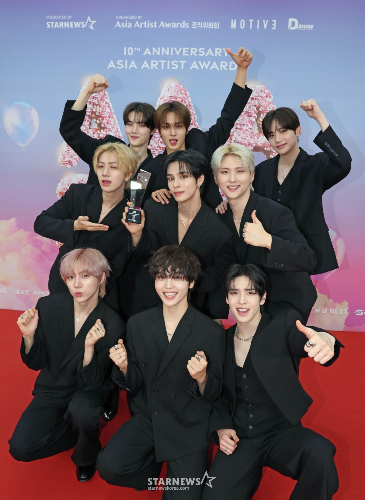 그룹 크래비티가 6일 가오슝 내셔널 스타디움에서 진행된 스타뉴스 주최 '10주년 아시아 아티스트 어워즈 2025(10th Anniversary Asia Artist Awards 2025, '10주년 AAA 2025')에서 AAA아이콘 상을 수상한 뒤 포즈를 취하고 있다.