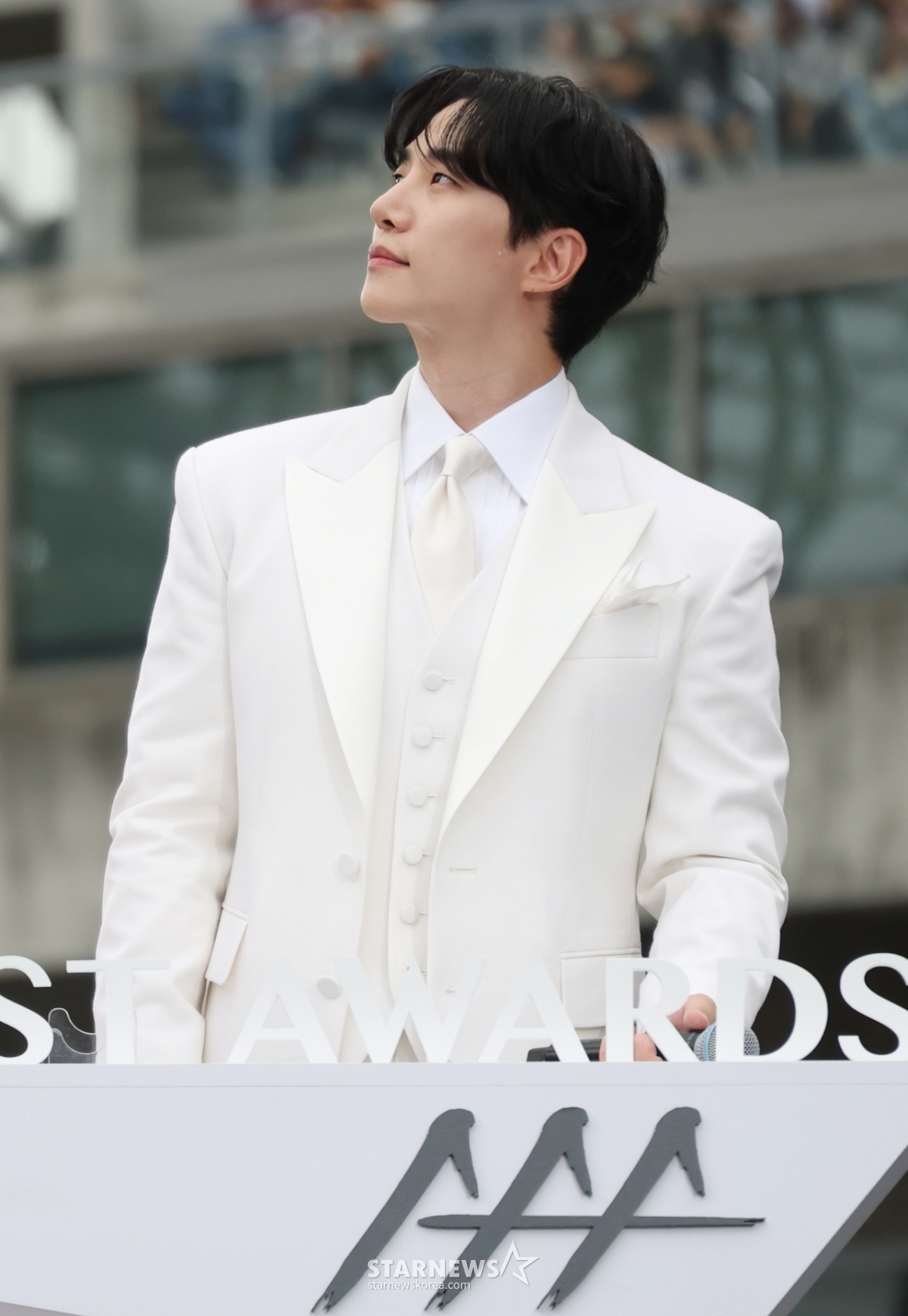 MC 이준호가 6일 가오슝 내셔널 스타디움에서 진행된 스타뉴스 주최 '10주년 아시아 아티스트 어워즈 2025(10th Anniversary Asia Artist Awards 2025, '10주년 AAA 2025')에서 360도 무대를 놀란 표정으로 바라보고 있다.