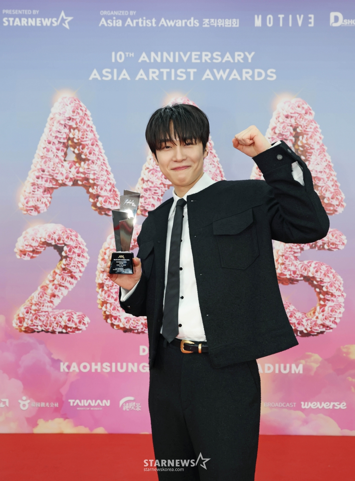 배우 강유석이 6일 가오슝 내셔널 스타디움에서 진행된 스타뉴스 주최 '10주년 아시아 아티스트 어워즈 2025(10th Anniversary Asia Artist Awards 2025, '10주년 AAA 2025')에서 배우부문 AAA 이모티브 상을 수상한 뒤 포즈를 취하고 있다.