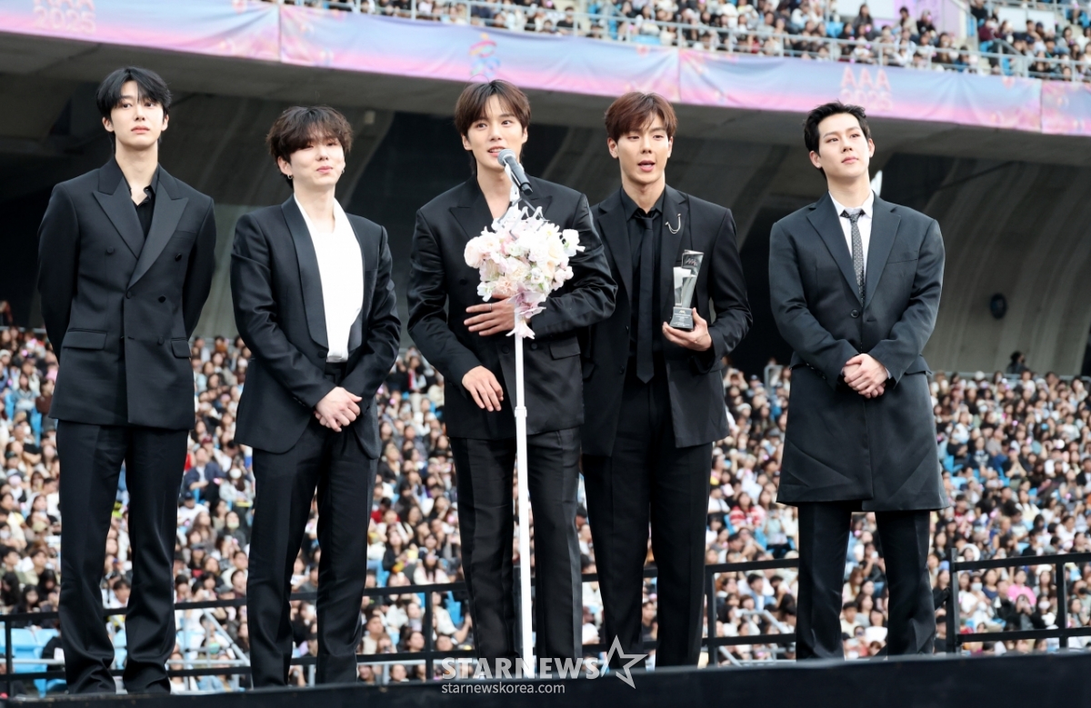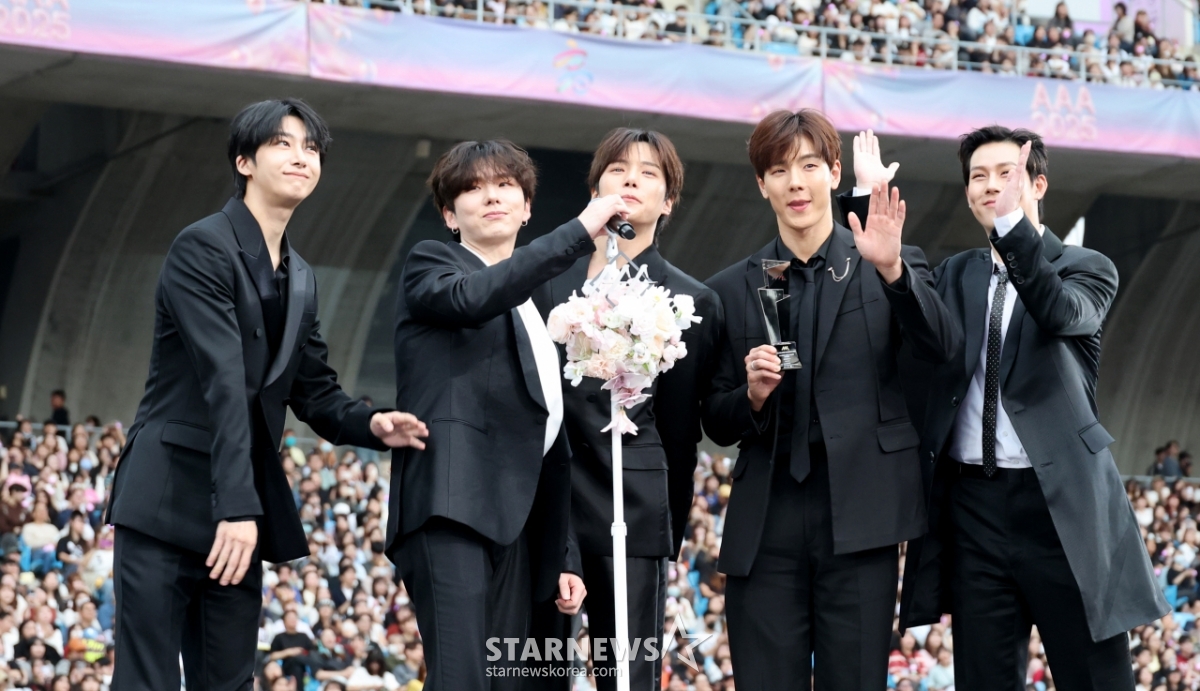 AAA 베스트 아티스트상 몬스터엑스가 6일 대만 가오슝 내셔널 스타디움에서 진행된 스타뉴스 주최 '10주년 아시아 아티스트 어워즈 2025(10th Anniversary Asia Artist Awards 2025, '10주년 AAA 2025')에서 수상소감을 전하고 있다. 12월 6일~7일 양일에 걸쳐 가오슝 내셔널 스타디움에서 펼쳐지는 '10주년 아시아 아티스트 어워즈 2025(10th Anniversary Asia Artist Awards 2025, '10주년 AAA 2025')'와 페스타 'ACON 2025'는 MTN(머니투데이방송)과 위버스(Weverse)를 통해 각각 TV와 온라인 스트리밍으로 생중계 된다. 2025.12.06