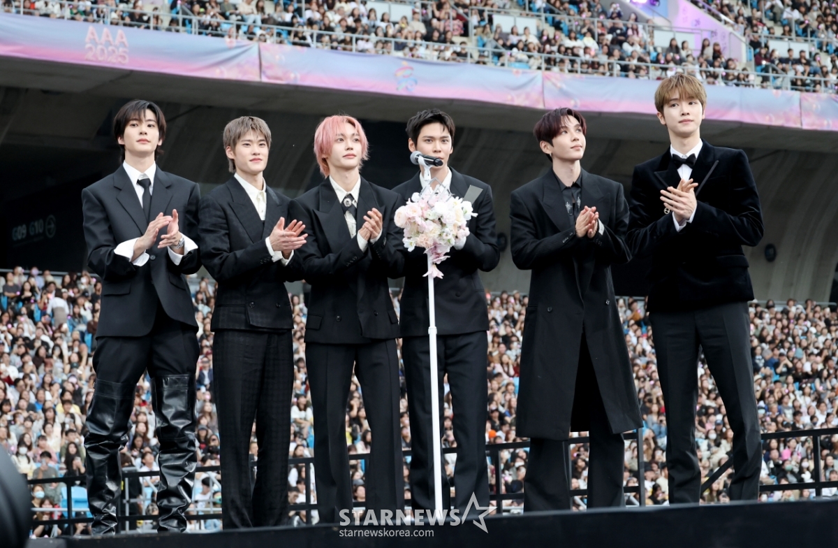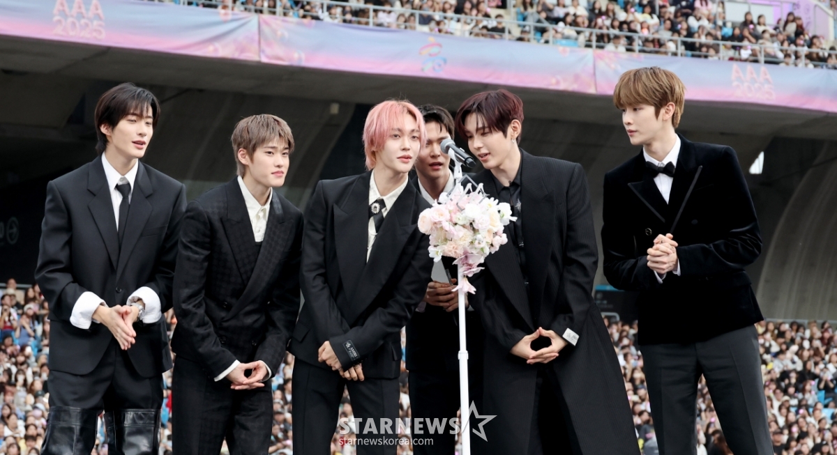 AAA EMOTIVE상 수상한 RIIZE가 6일 대만 가오슝 내셔널 스타디움에서 진행된 스타뉴스 주최 '10주년 아시아 아티스트 어워즈 2025(10th Anniversary Asia Artist Awards 2025, '10주년 AAA 2025')에서 수상소감을 전하고 있다. 12월 6일~7일 양일에 걸쳐 가오슝 내셔널 스타디움에서 펼쳐지는 '10주년 아시아 아티스트 어워즈 2025(10th Anniversary Asia Artist Awards 2025, '10주년 AAA 2025')'와 페스타 'ACON 2025'는 MTN(머니투데이방송)과 위버스(Weverse)를 통해 각각 TV와 온라인 스트리밍으로 생중계 된다. 2025.12.06