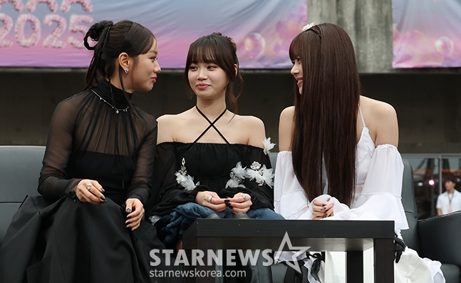 배우 겸 가수 혜리가 르세라핌 채원, 은채와 6일 가오슝 내셔널 스타디움에서 진행된 스타뉴스 주최 '10주년 아시아 아티스트 어워즈 2025(10th Anniversary Asia Artist Awards 2025, '10주년 AAA 2025') 수상자석에서 대화룰 나누고 있다.