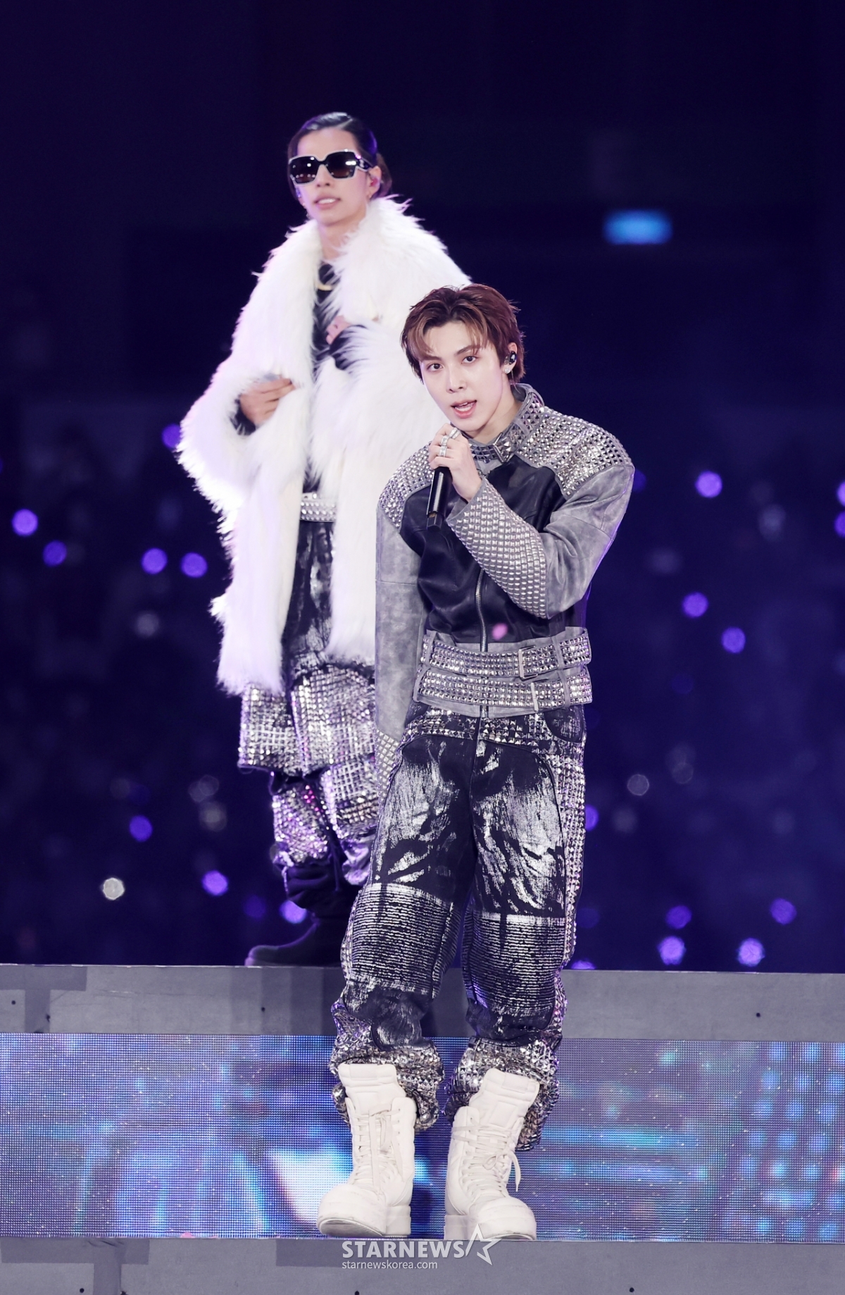 그룹 올데이프로젝트 타잔, 우찬이 6일 대만 가오슝 내셔널 스타디움에서 진행된 스타뉴스 주최 '10주년 아시아 아티스트 어워즈 2025(10th Anniversary Asia Artist Awards 2025, '10주년 AAA 2025')에서 멋진 무대를 선보이고 있다.