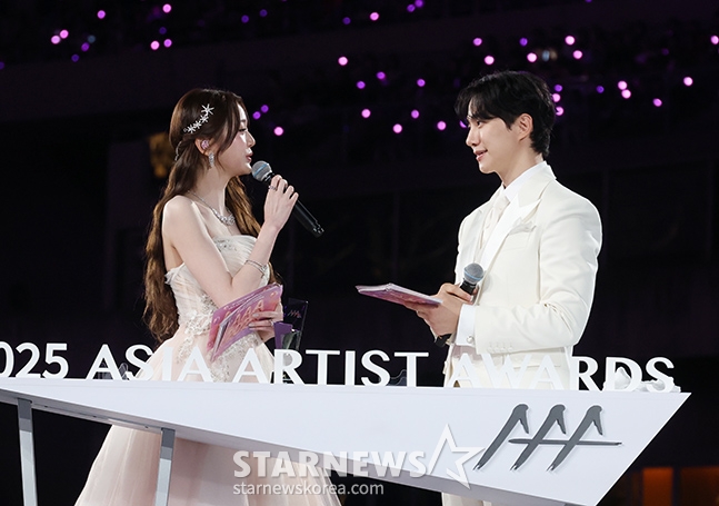 MC 이준호와 장원영이 6일 가오슝 내셔널 스타디움에서 진행된 스타뉴스 주최 '10주년 아시아 아티스트 어워즈 2025(10th Anniversary Asia Artist Awards 2025, '10주년 AAA 2025')에서 매끄러운 진행을 하고 있다.