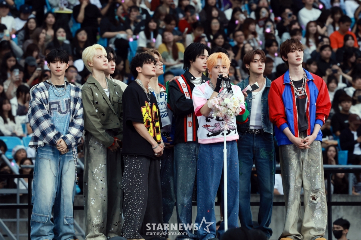 그룹 싸이커스가 6일 대만 가오슝 내셔널 스타디움에서 진행된 스타뉴스 주최 '10주년 아시아 아티스트 어워즈 2025(10th Anniversary Asia Artist Awards 2025, '10주년 AAA 2025')에서 AAA Potential상을 받고 수상소감을 말하고 있다.