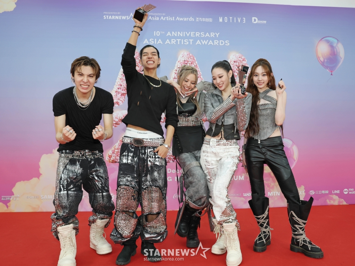 혼성그룹 올데이프로젝트가 6일 가오슝 내셔널 스타디움에서 진행된 스타뉴스 주최 '10주년 아시아 아티스트 어워즈 2025(10th Anniversary Asia Artist Awards 2025, '10주년 AAA 2025')에서 신인상, 핫트랜드상을 수상한 뒤 포즈를 취하고 있다.