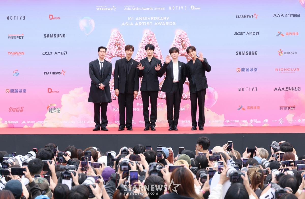 그룹 몬스타엑스가 6일 가오슝 내셔널 스타디움에서 진행된 스타뉴스 주최 '10주년 아시아 아티스트 어워즈 2025(10th Anniversary Asia Artist Awards 2025, '10주년 AAA 2025') 레드카펫 행사에 참석해 포즈를 취하고 있다.