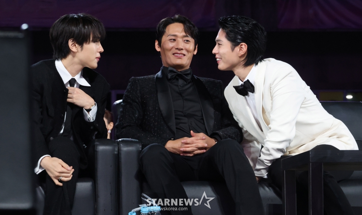 배우 박보검이 6일 가오슝 내셔널 스타디움에서 진행된 스타뉴스 주최 '10주년 아시아 아티스트 어워즈 2025(10th Anniversary Asia Artist Awards 2025, '10주년 AAA 2025') 수상자 대기석에서 최대훈 등과 대화를 나누고 있다.