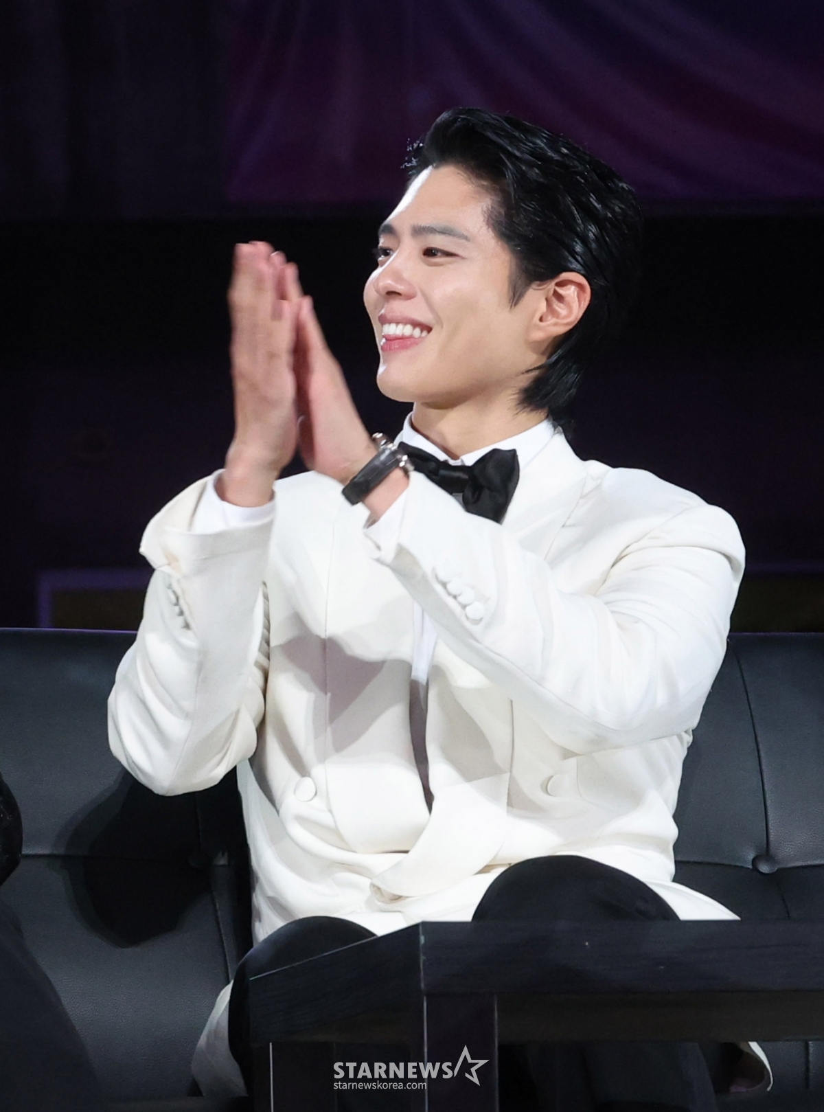 배우 박보검이 6일 가오슝 내셔널 스타디움에서 진행된 스타뉴스 주최 '10주년 아시아 아티스트 어워즈 2025(10th Anniversary Asia Artist Awards 2025, '10주년 AAA 2025') 수상자 대기석에서 아이유의 수상을 축하하고 있다.