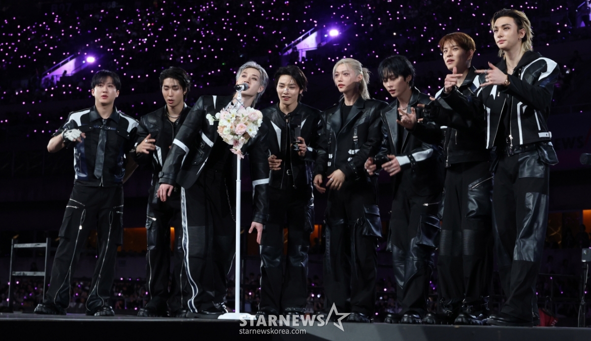 ADP가 6일 가오슝 내셔널 스타디움에서 진행된 스타뉴스 주최 '10주년 아시아 아티스트 어워즈 2025(10th Anniversary Asia Artist Awards 2025, '10주년 AAA 2025')에서 수상 소감을 밝히고 있다.