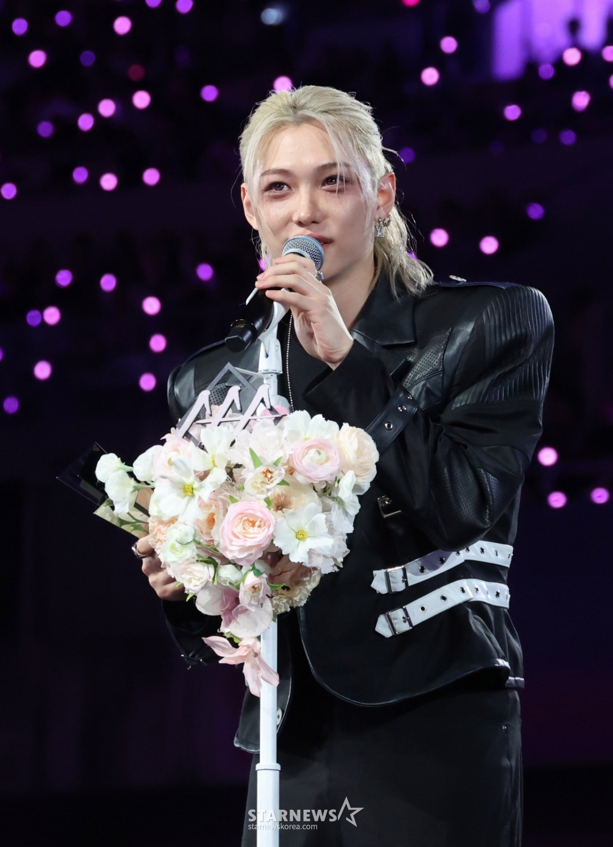 스트레이 키즈 필릭스가 6일 가오슝 내셔널 스타디움에서 진행된 스타뉴스 주최 '10주년 아시아 아티스트 어워즈 2025(10th Anniversary Asia Artist Awards 2025, '10주년 AAA 2025')에서 수상 소감을 밝히고 있다.
