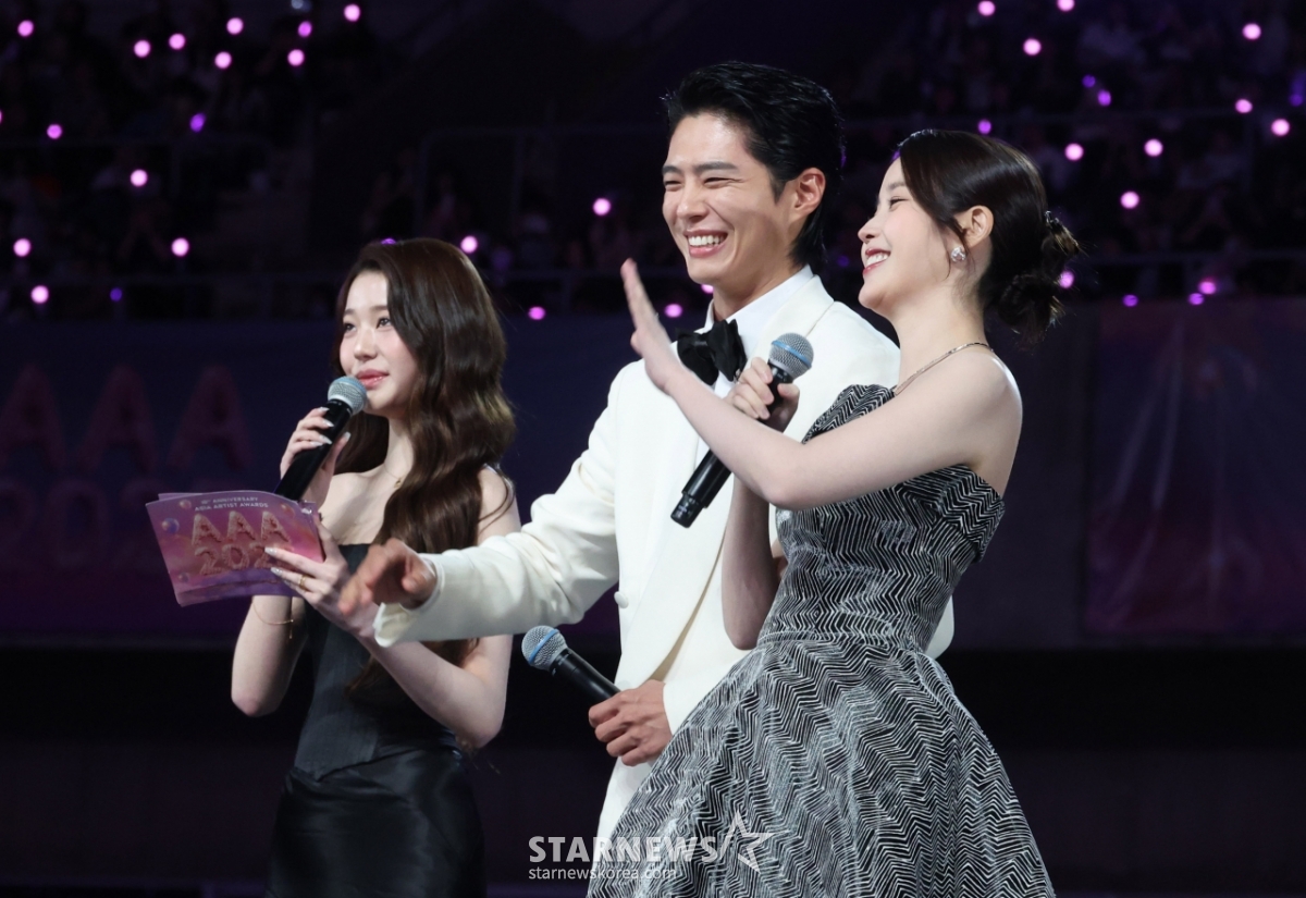 배우 박보검과 이지은이 6일 가오슝 내셔널 스타디움에서 진행된 스타뉴스 주최 '10주년 아시아 아티스트 어워즈 2025(10th Anniversary Asia Artist Awards 2025, '10주년 AAA 2025')에서 장원영의 인터뷰에 응하고 있다.