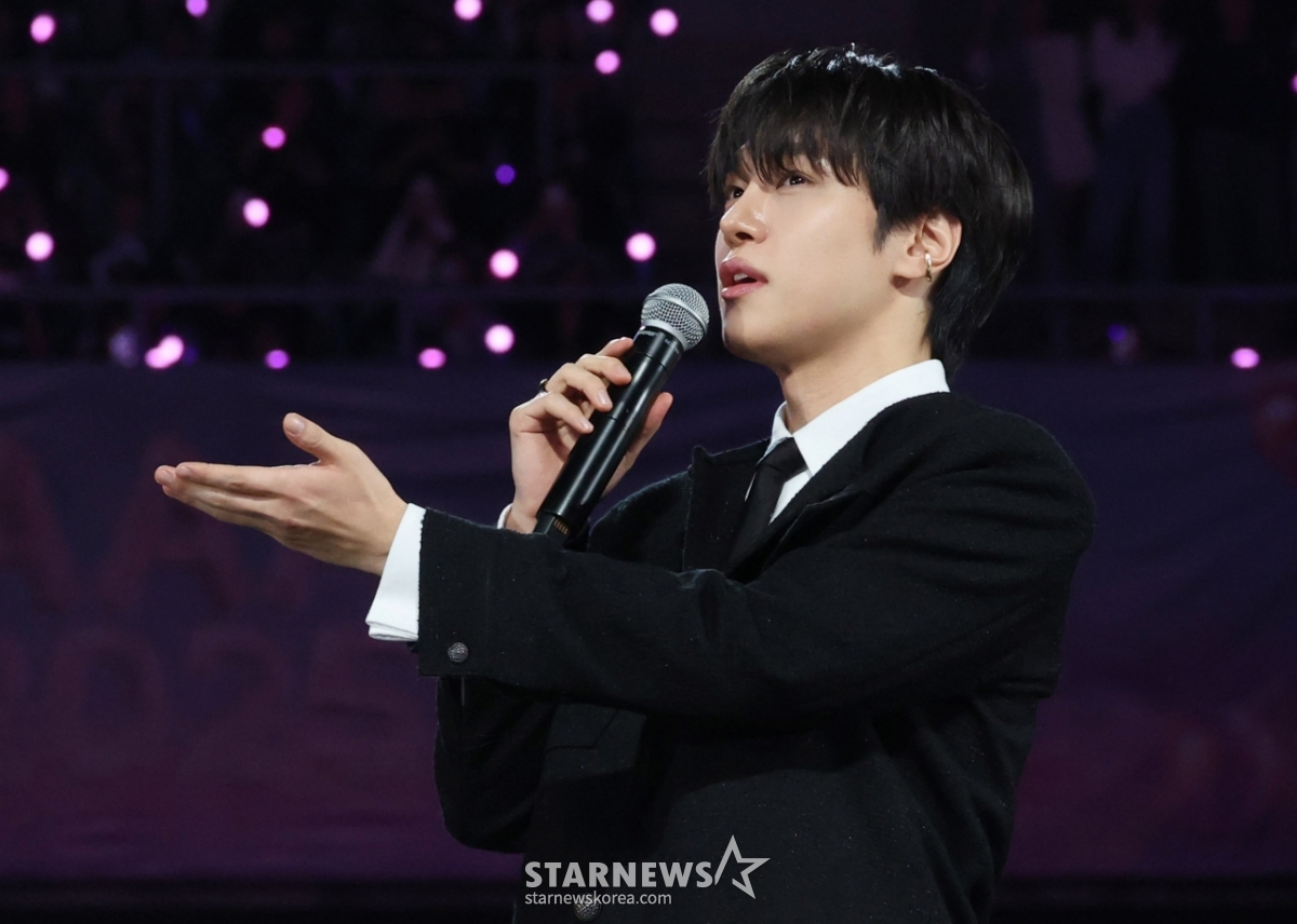 배우 강유석이 6일 가오슝 내셔널 스타디움에서 진행된 스타뉴스 주최 '10주년 아시아 아티스트 어워즈 2025(10th Anniversary Asia Artist Awards 2025, '10주년 AAA 2025')에서 아이유의 수상을 축하하고 있다.