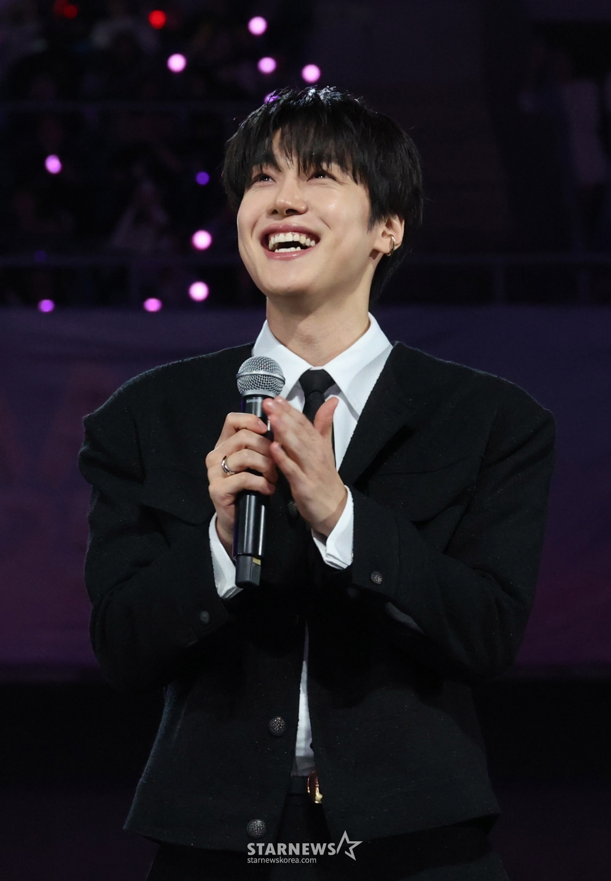 배우 강유석이 6일 가오슝 내셔널 스타디움에서 진행된 스타뉴스 주최 '10주년 아시아 아티스트 어워즈 2025(10th Anniversary Asia Artist Awards 2025, '10주년 AAA 2025')에서 아이유의 수상을 축하하고 있다.