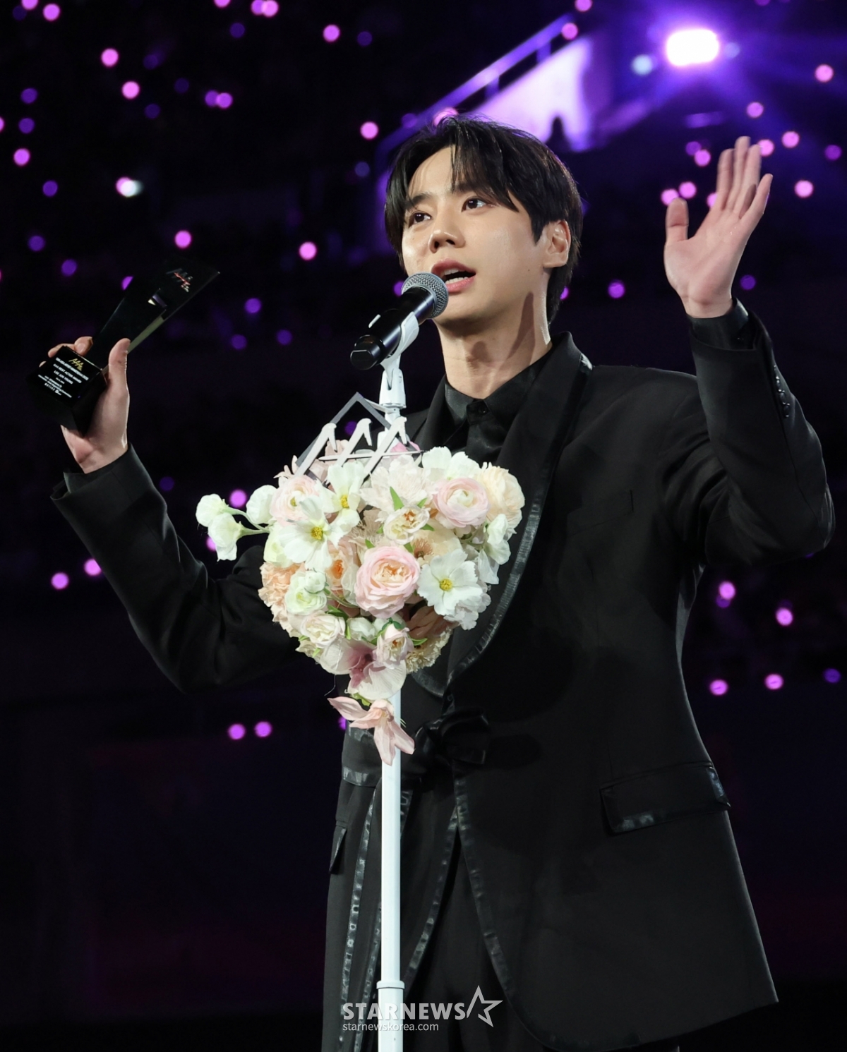 배우 이준영이 6일 가오슝 내셔널 스타디움에서 진행된 스타뉴스 주최 '10주년 아시아 아티스트 어워즈 2025(10th Anniversary Asia Artist Awards 2025, '10주년 AAA 2025')에서 수상 소감을 밝히고 있다.