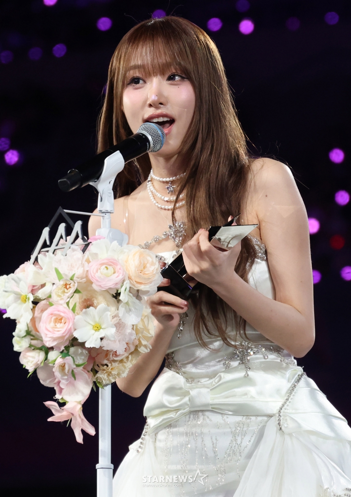 가수 차예나가 6일 가오슝 내셔널 스타디움에서 진행된 스타뉴스 주최 '10주년 아시아 아티스트 어워즈 2025(10th Anniversary Asia Artist Awards 2025, '10주년 AAA 2025')에서 수상 소감을 밝히고 있다.