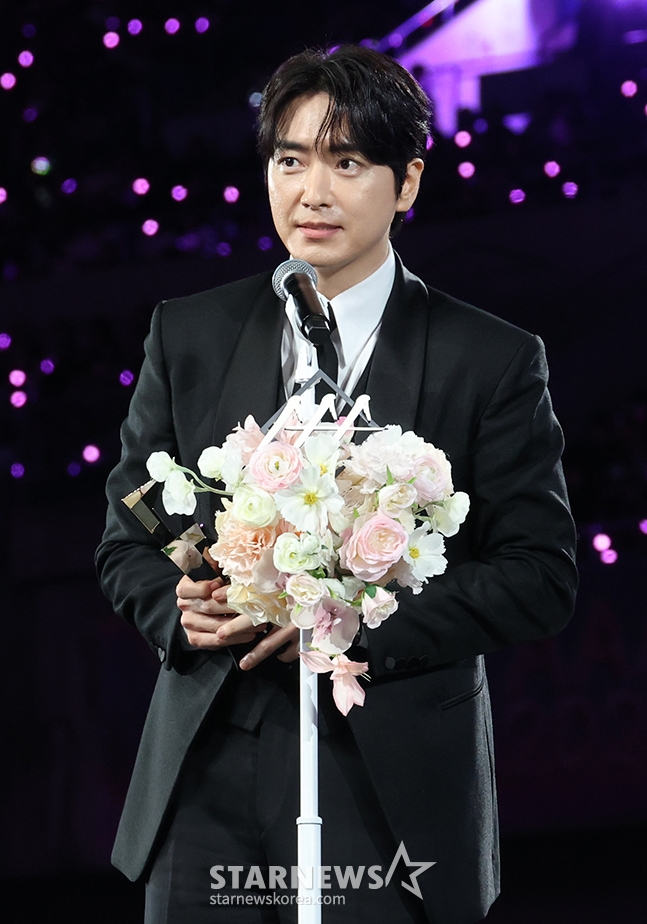 배우 이준혁이 6일 가오슝 내셔널 스타디움에서 진행된 스타뉴스 주최 '10주년 아시아 아티스트 어워즈 2025(10th Anniversary Asia Artist Awards 2025, '10주년 AAA 2025')에서 수상 소감을 밝히고 있다.