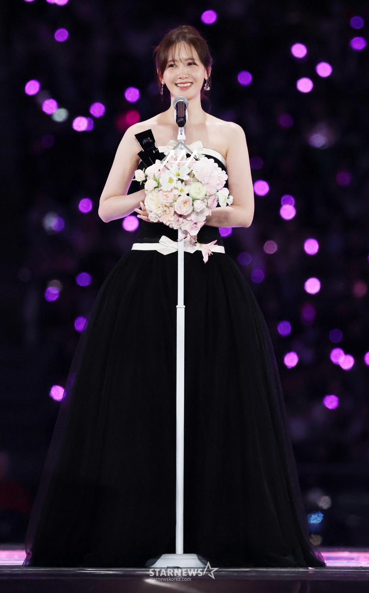 배우 임윤아가 6일 대만 가오슝 내셔널 스타디움에서 진행된 스타뉴스 주최 '10주년 아시아 아티스트 어워즈 2025(10th Anniversary Asia Artist Awards 2025, '10주년 AAA 2025')에서 올해의 여우주연상을 수상한 뒤 수상소감을 전하고 있다.