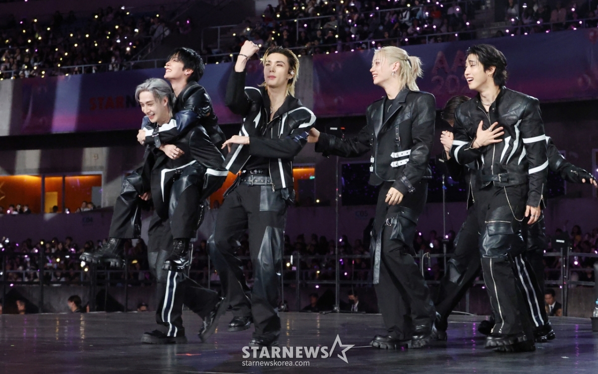 스트레이키즈가 6일 가오슝 내셔널 스타디움에서 진행된 스타뉴스 주최 '10주년 아시아 아티스트 어워즈 2025(10th Anniversary Asia Artist Awards 2025, '10주년 AAA 2025')에서 대상에 호명되자 환호하며 무대로 향하고 있다.
