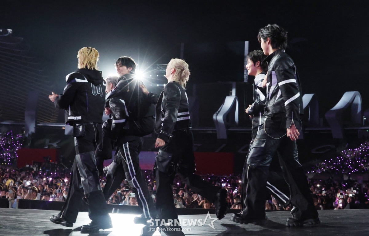 스트레이키즈가 6일 가오슝 내셔널 스타디움에서 진행된 스타뉴스 주최 '10주년 아시아 아티스트 어워즈 2025(10th Anniversary Asia Artist Awards 2025, '10주년 AAA 2025')에서 대상에 호명되자 기뻐하며 무대로 향하고 있다.