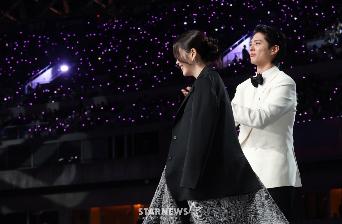 배우 아이유가 6일 가오슝 내셔널 스타디움에서 진행된 스타뉴스 주최 '10주년 아시아 아티스트 어워즈 2025(10th Anniversary Asia Artist Awards 2025, '10주년 AAA 2025')에서 대상에 호명되자 박보검의 축하를 받으며 무대로 향하고 있다.