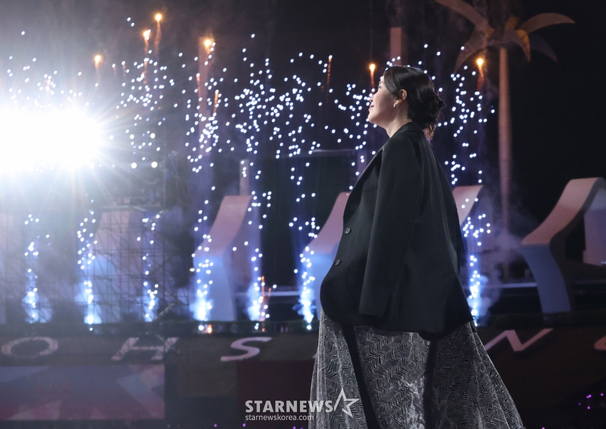 배우 아이유가 6일 가오슝 내셔널 스타디움에서 진행된 스타뉴스 주최 '10주년 아시아 아티스트 어워즈 2025(10th Anniversary Asia Artist Awards 2025, '10주년 AAA 2025')에서 대상에 호명된 후 관중의 축하를 받으며 무대로 향하고 있다.