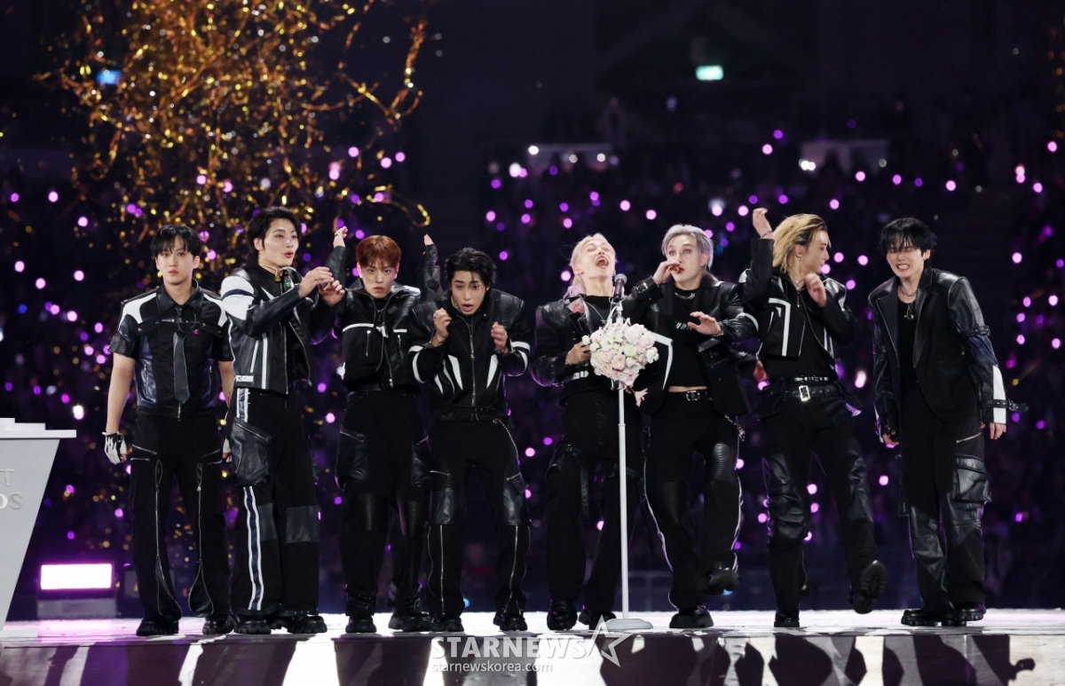 그룹 스트레이키즈가 6일 대만 가오슝 내셔널 스타디움에서 진행된 스타뉴스 주최 '10주년 아시아 아티스트 어워즈 2025(10th Anniversary Asia Artist Awards 2025, '10주년 AAA 2025')에서 올해의 가수상을 수상한 뒤 수상소감을 전하고 있다.