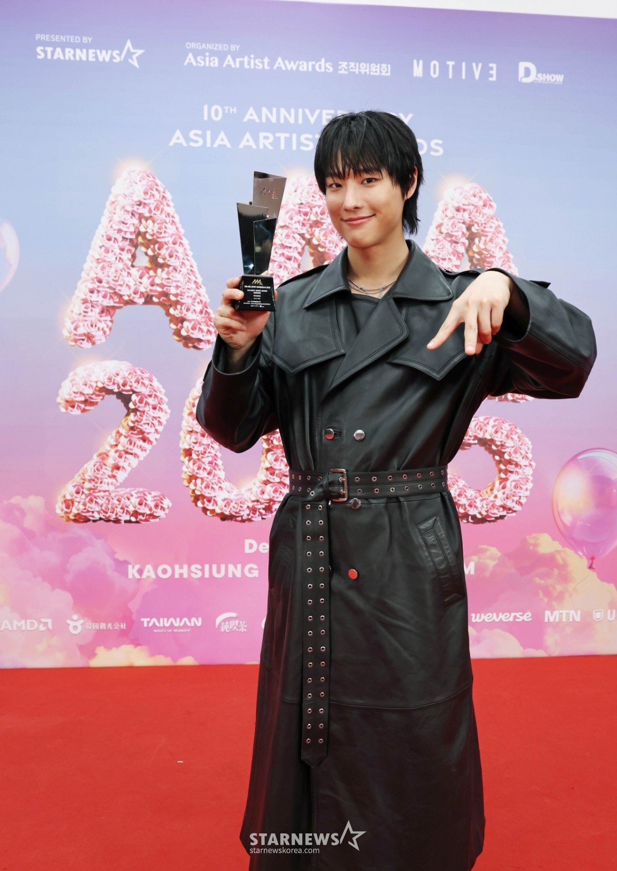 가수 우즈가 6일 가오슝 내셔널 스타디움에서 진행된 스타뉴스 주최 '10주년 아시아 아티스트 어워즈 2025(10th Anniversary Asia Artist Awards 2025, '10주년 AAA 2025')에서 베스트 아티스트 상을 수상한 뒤 포즈를 취하고 있다.