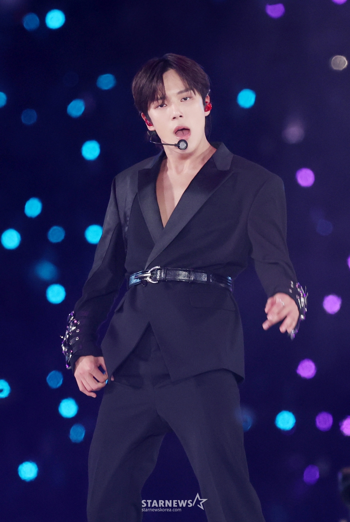 그룹 몬스타엑스 민혁이 6일 대만 가오슝 내셔널 스타디움에서 진행된 스타뉴스 주최 '10주년 아시아 아티스트 어워즈 2025(10th Anniversary Asia Artist Awards 2025, '10주년 AAA 2025')에서 멋진 무대를 선보이고 있다.