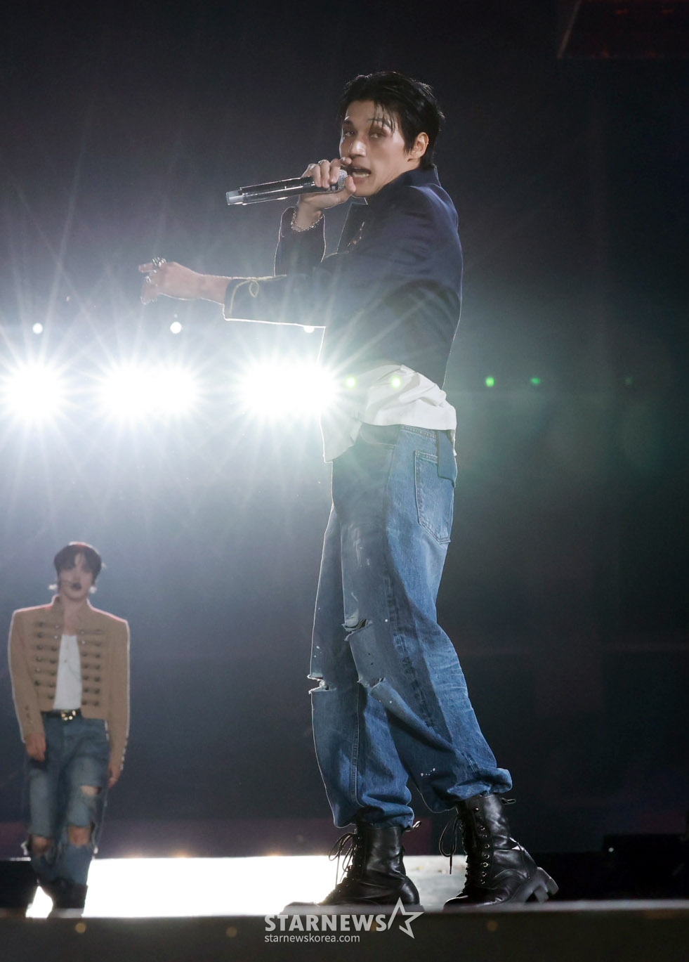 그룹 에이티즈 우영이 7일 가오슝 내셔널 스타디움에서 진행된 스타뉴스 주최 '10주년 아시아 아티스트 어워즈 2025(10th Anniversary Asia Artist Awards 2025, '10주년 AAA 2025')를 기념하는 'ACON 2025'에서 멋진 무대를 선보이고 있다.