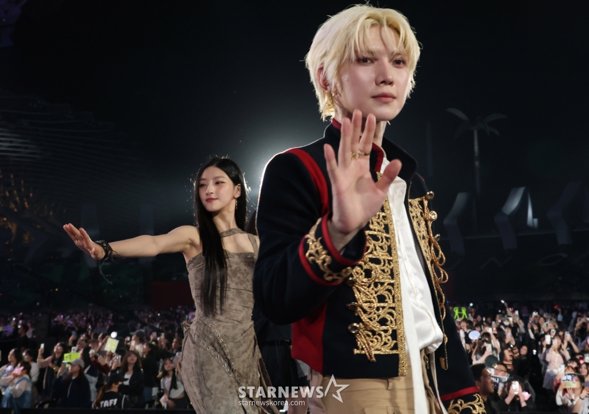 에이티즈 여상이 7일 가오슝 내셔널 스타디움에서 진행된 스타뉴스 주최 '10주년 아시아 아티스트 어워즈 2025(10th Anniversary Asia Artist Awards 2025, '10주년 AAA 2025')를 기념하는 'ACON 2025'를 마친 후 피날레 세리머니를 하고 있다.