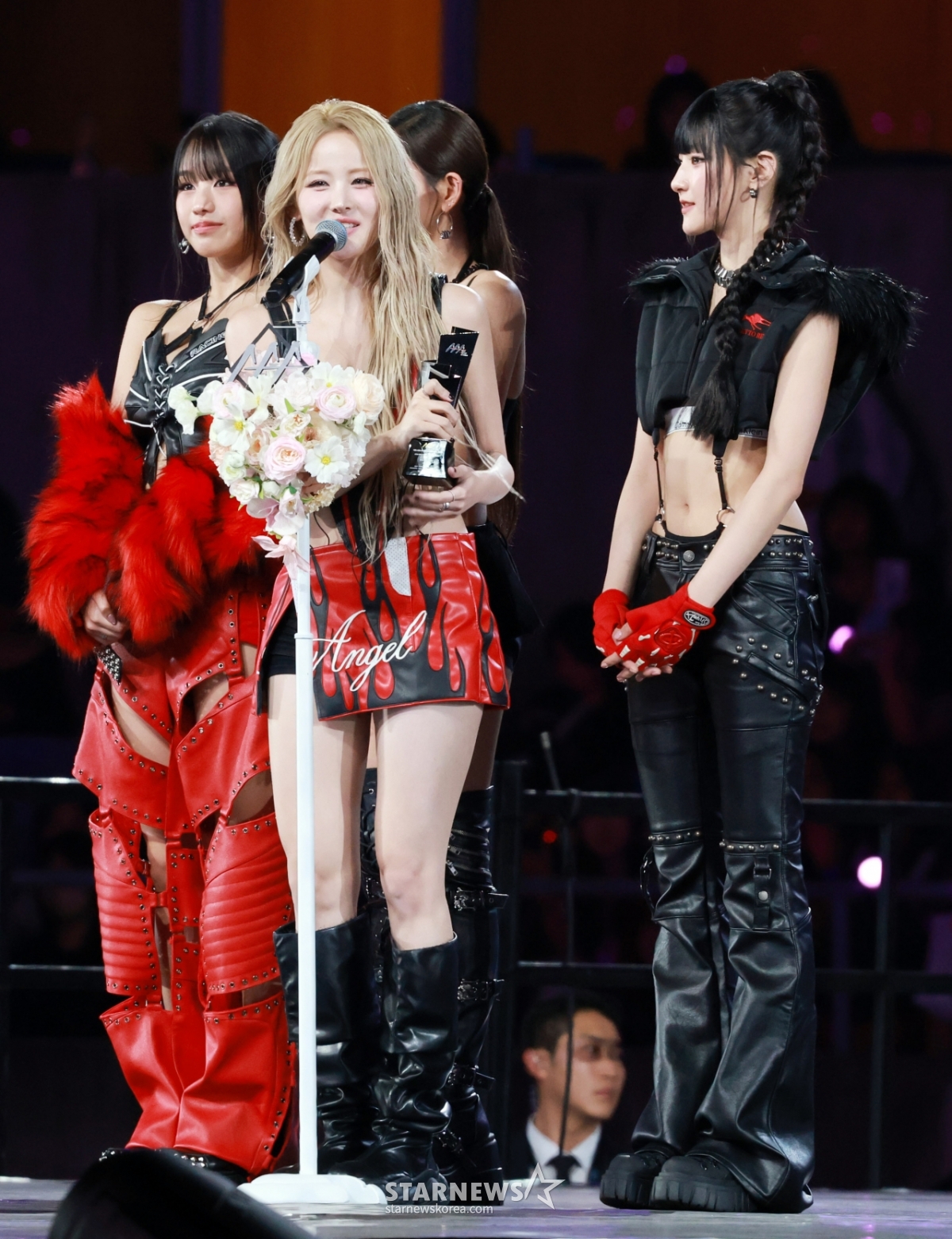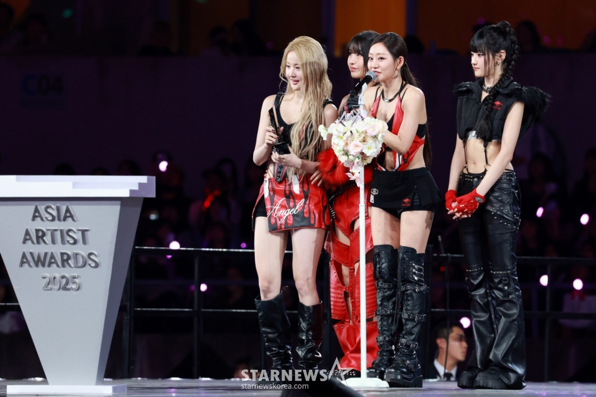 그룹 키스오브라이프가 6일 가오슝 내셔널 스타디움에서 진행된 스타뉴스 주최 '10주년 아시아 아티스트 어워즈 2025(10th Anniversary Asia Artist Awards 2025, '10주년 AAA 2025')에서 AAA 베스트 그룹 뮤지션 상 수상소감을 전하고 있다.