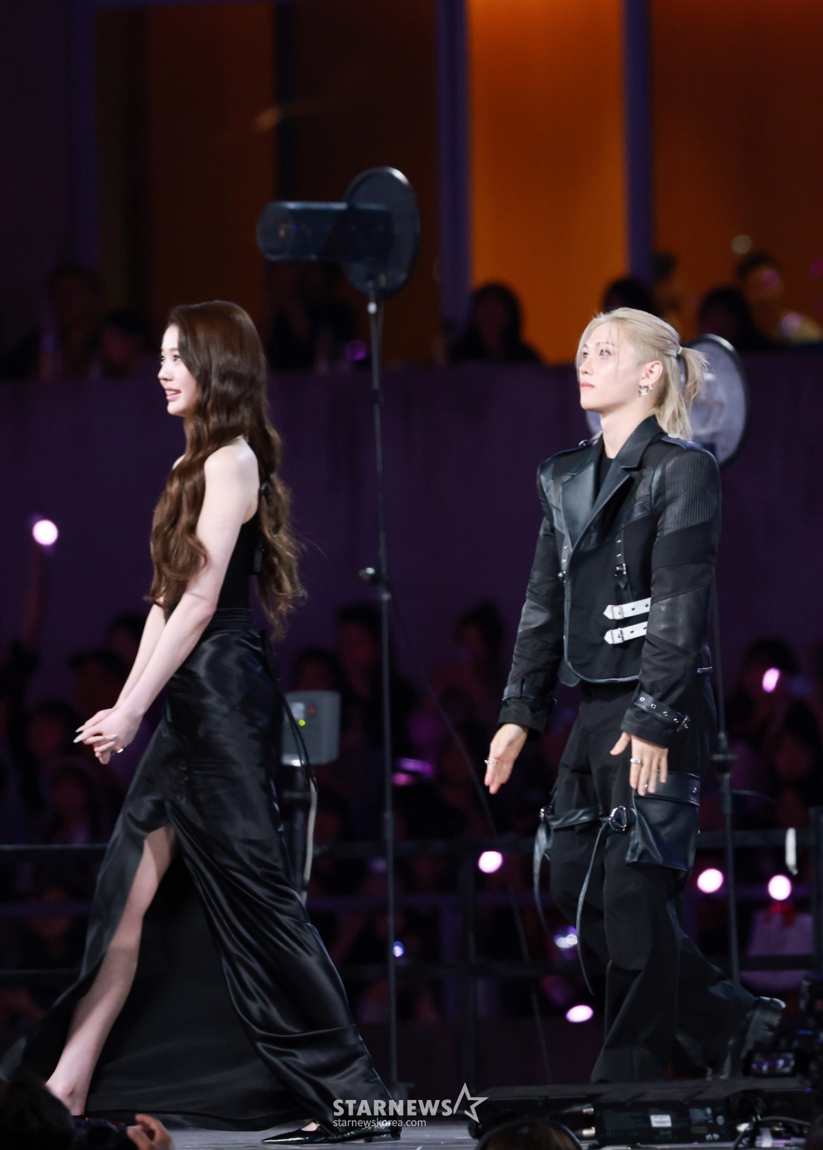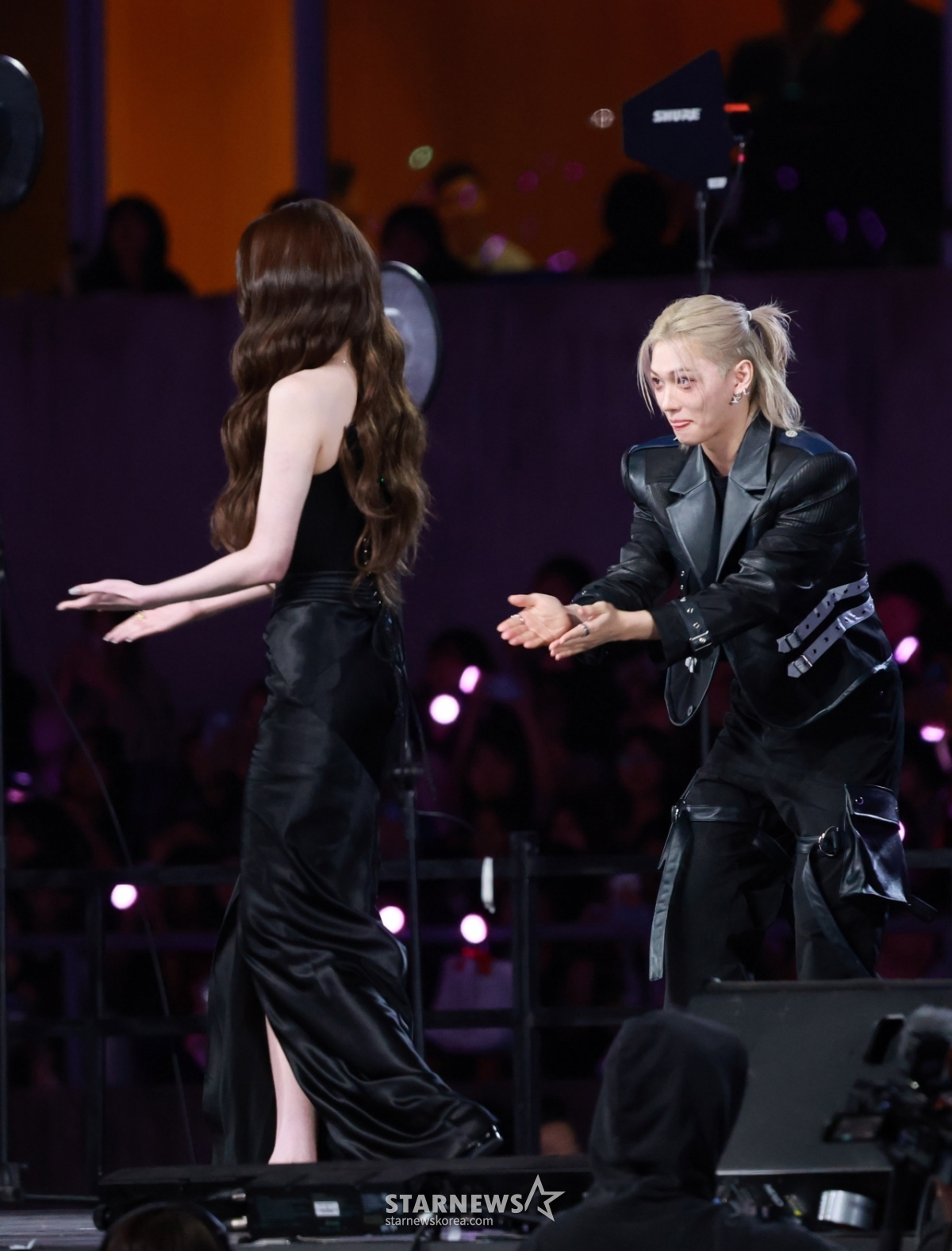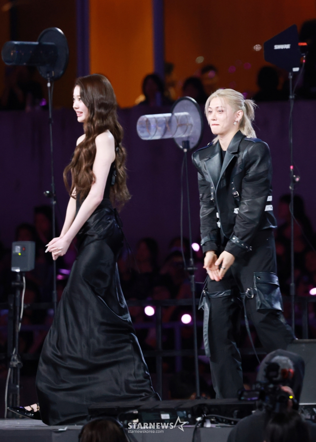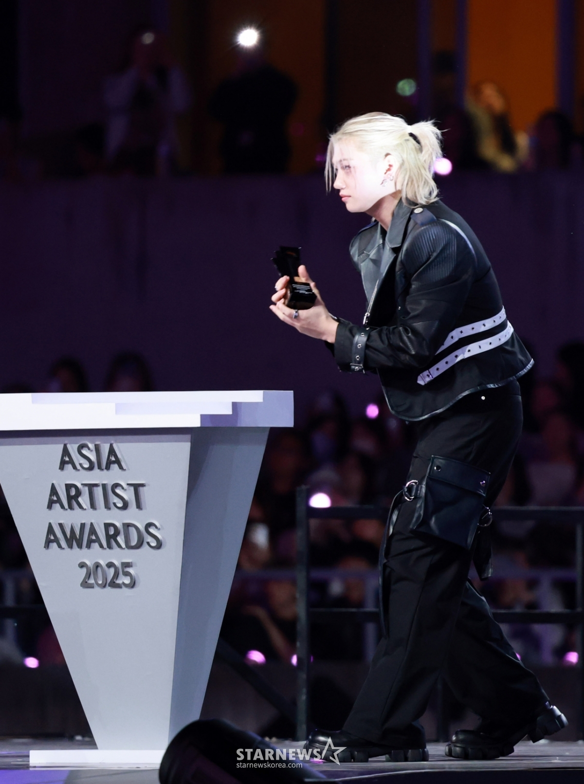 그룹 스트레이키즈(Stray Kids)필리스와 아이브(IVE) 장원영이 6일 가오슝 내셔널 스타디움에서 진행된 스타뉴스 주최 '10주년 아시아 아티스트 어워즈 2025(10th Anniversary Asia Artist Awards 2025, '10주년 AAA 2025')에서 AAA Grand Presence of K-POP을 받고 소감을 말하고 있다.
