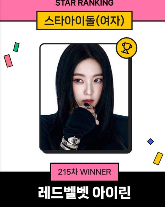아이린은 4일 오후 3시 1분부터 11일 오후 3시까지 진행된 215차 스타랭킹 스타아이돌 여자 랭킹 투표에서 1만9254표를 획득해 1위를 차지했다.